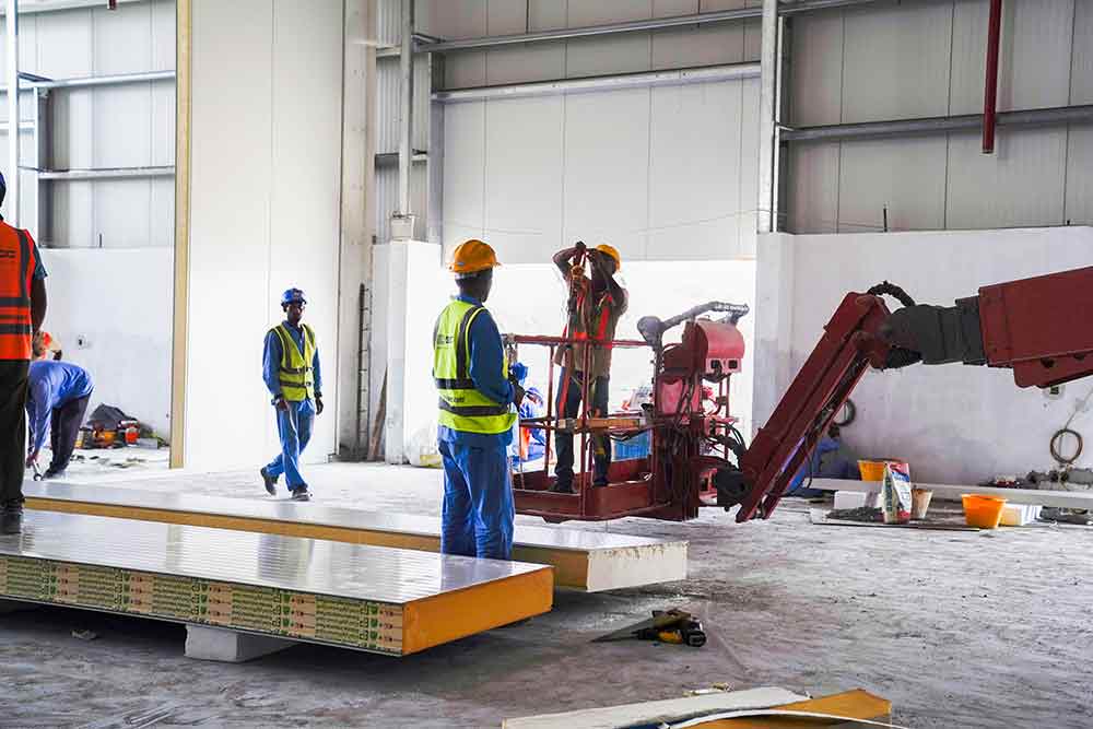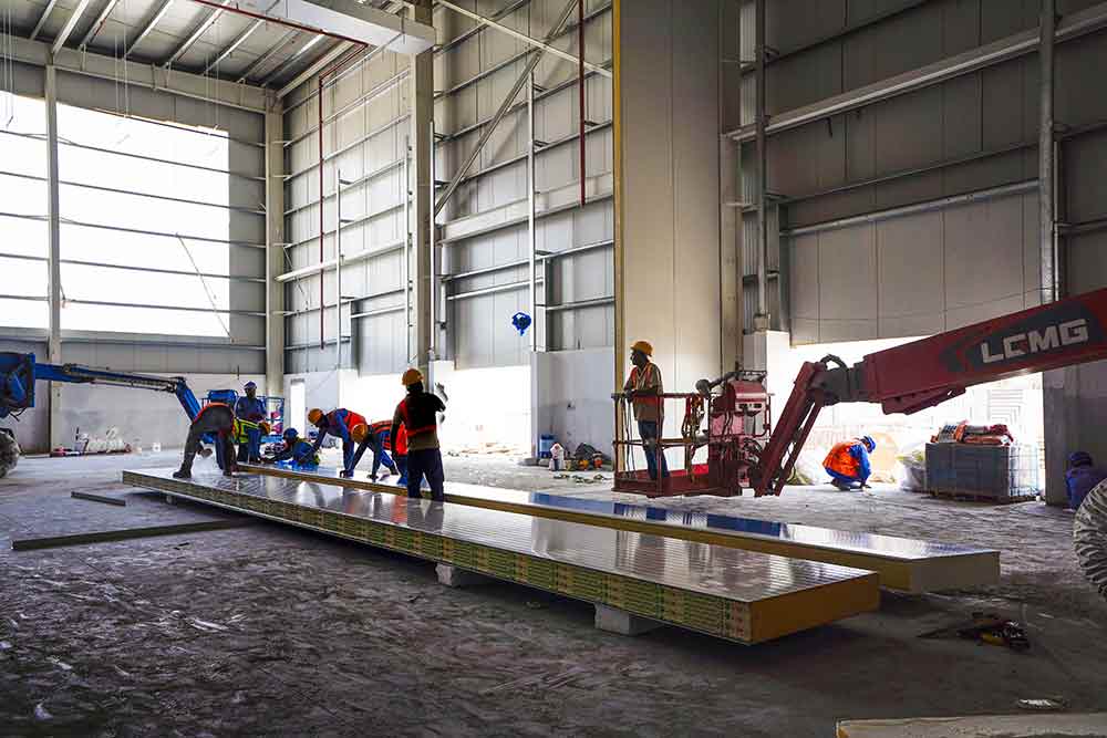 Significant milestones have been achieved in recent weeks. The steel structure and exterior panels are now nearly complete, and interior work is well underway. Teams on-site are currently installing insulated wall panels, flooring systems, and technical fittings for the main production and testing areas.